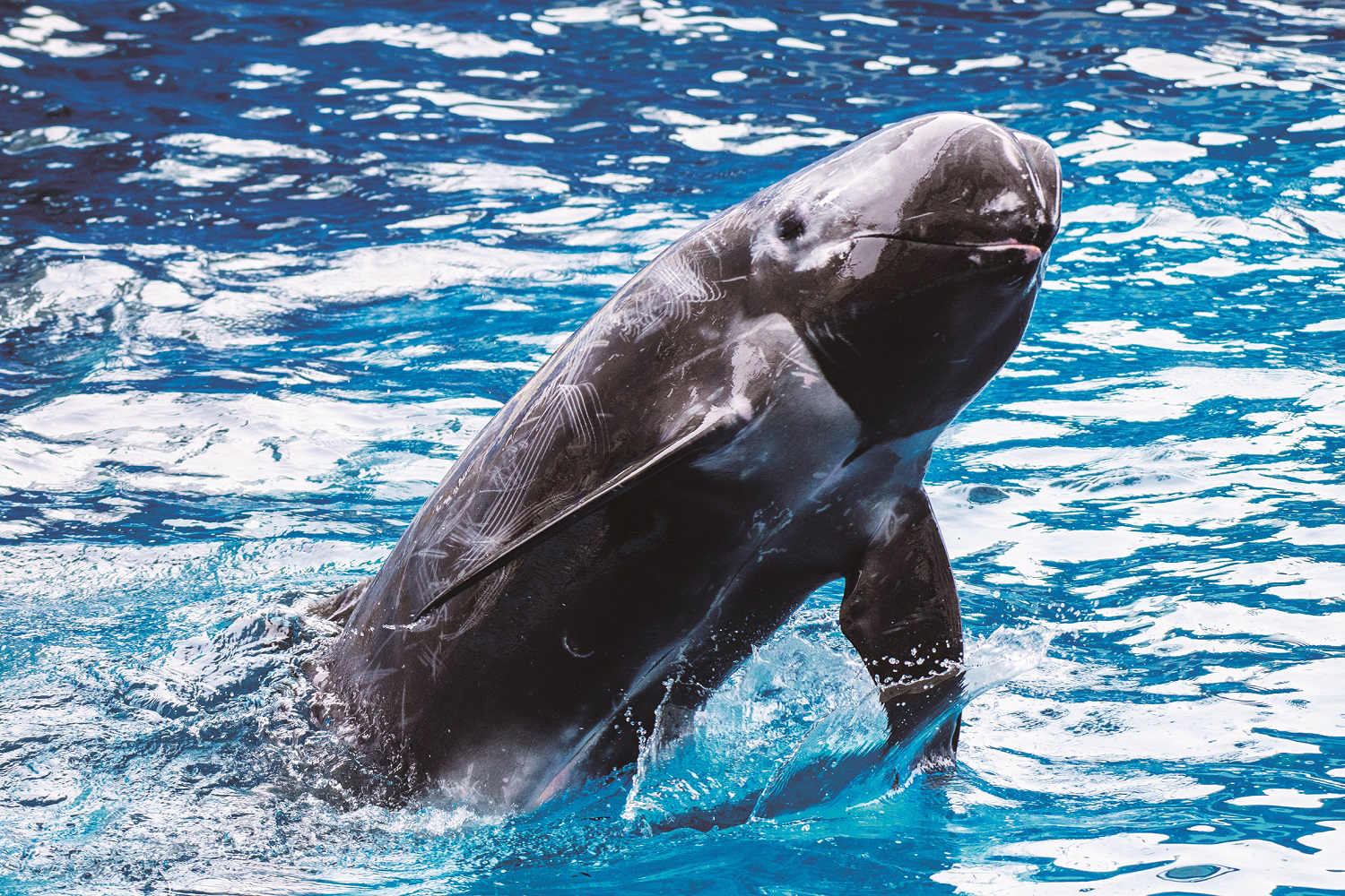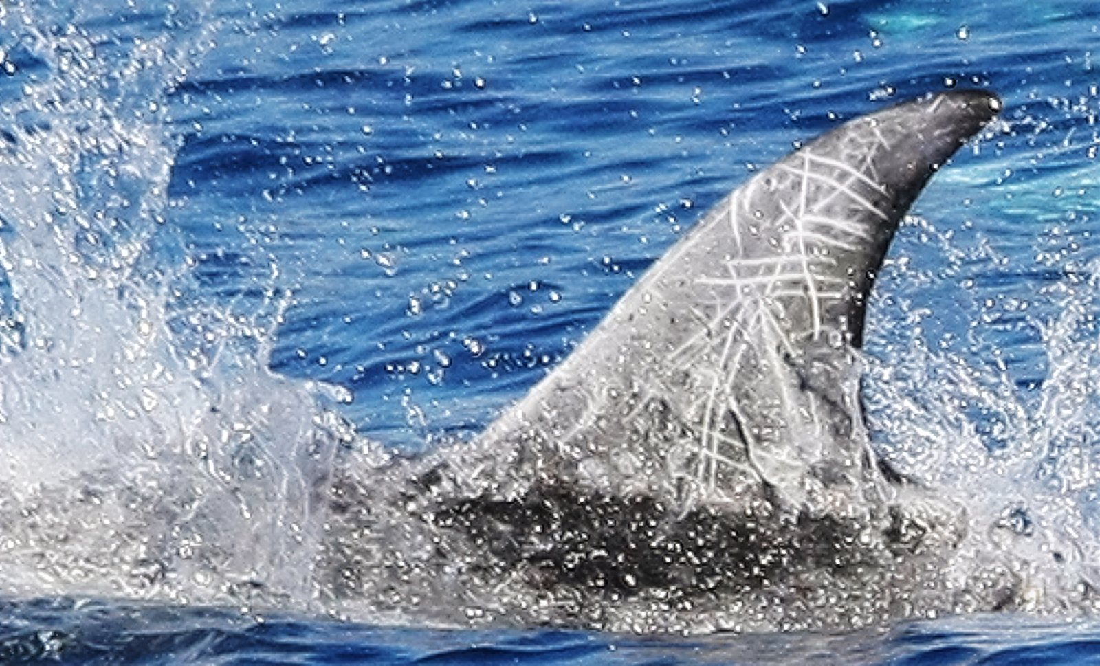 這些獨特的紋路,是花紋海豚「用身體寫日記」的證明。不同於其他鯨豚,牠們的皮膚在受傷癒合之後,不會回到原本的深色,而是留下淺白色的疤痕。每一道交錯的線條,都記錄了牠們在大海中與同類互動、生存碰撞的生命歷程。