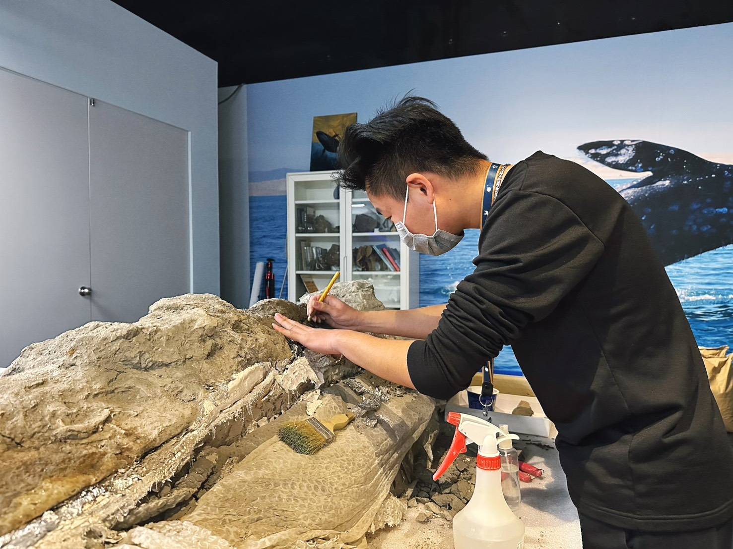 為了確保化石在搬運過程中不致斷裂,研究團隊必須先在野外為骨骼噴上黏著劑,再包上鋁箔紙,以石膏密封固定。因此,這些被層層保護的骨骼運回博物館後,還需要經過精細的清修作業,才能還原真貌。為此,策展團隊特別在展場設計了「清修實驗室」,讓觀眾能近距離觀察研究人員如何細心處理這具灰鯨骨骼,見證牠重現光明的過程 。