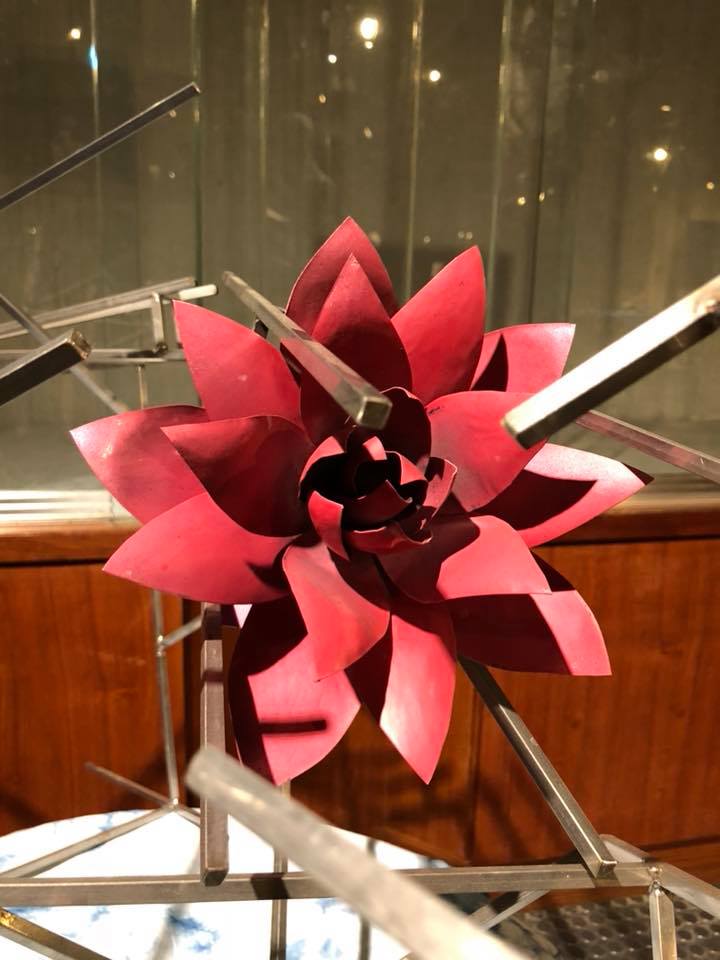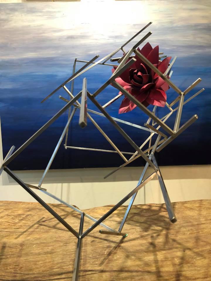 從工業工程與管理背景出發,蔣育鳳最初只是想在工作之餘學習花藝,未料一路從花藝師走向空間策展與裝置藝術創作。她將柔軟花草結合金屬、枯木與藍染等複合媒材,讓「軟與硬」、「有機與無機」在作品中對話共生。無論是在中國科技大學新竹校區展出的〈生命之樹〉,或曾設置於竹東文創園區的裝置創作,都展現她以金屬支撐柔美意象的獨特語彙,讓材質彼此成就。
